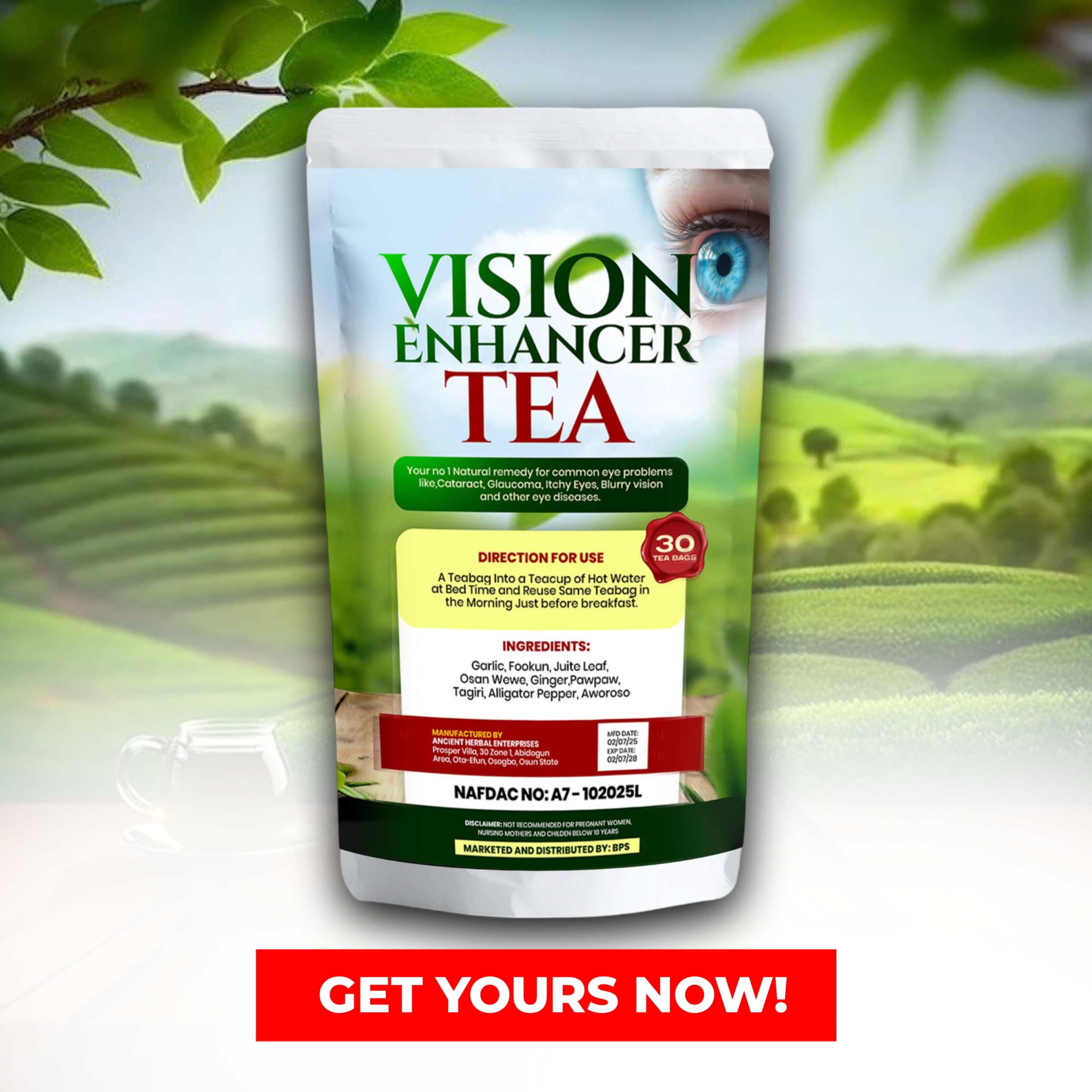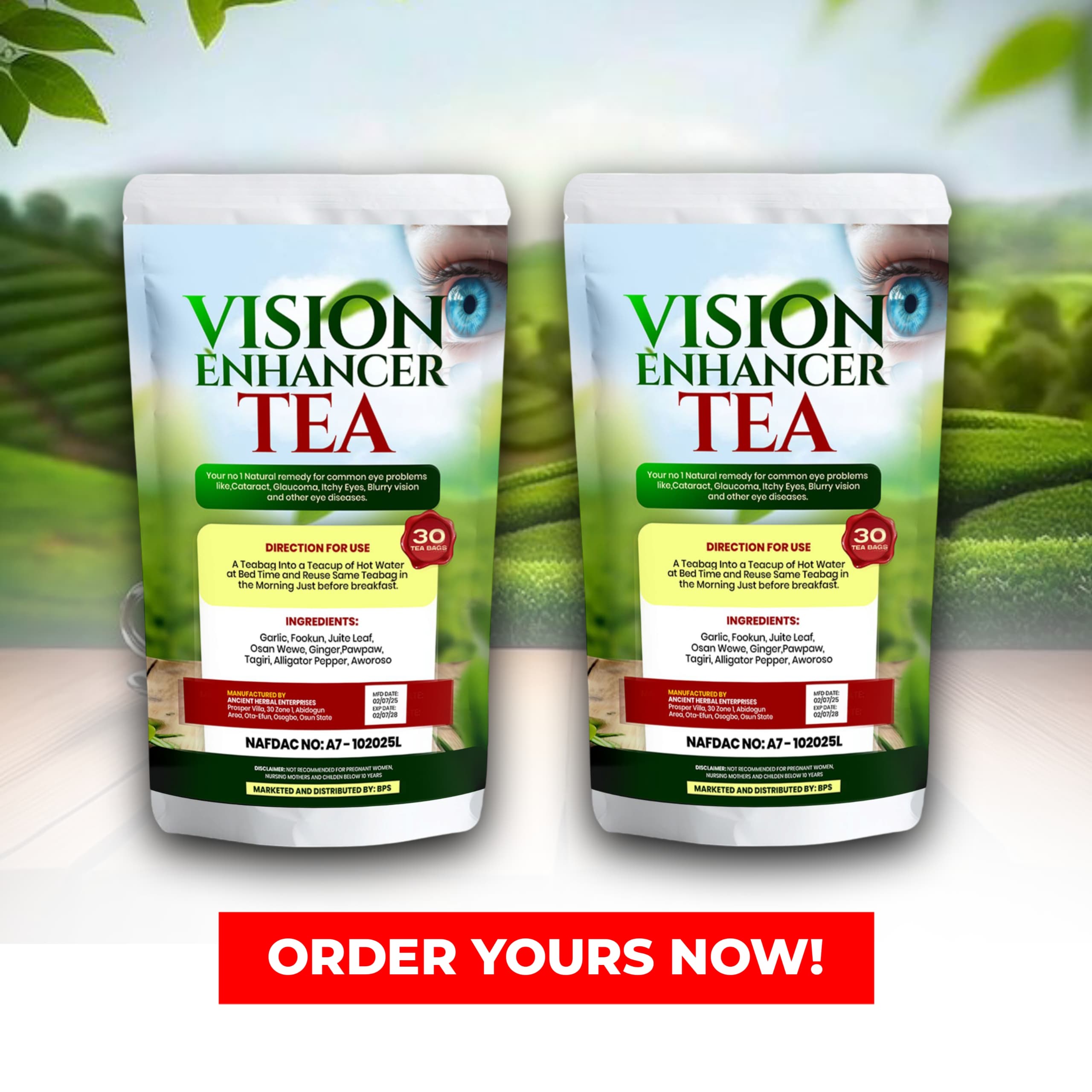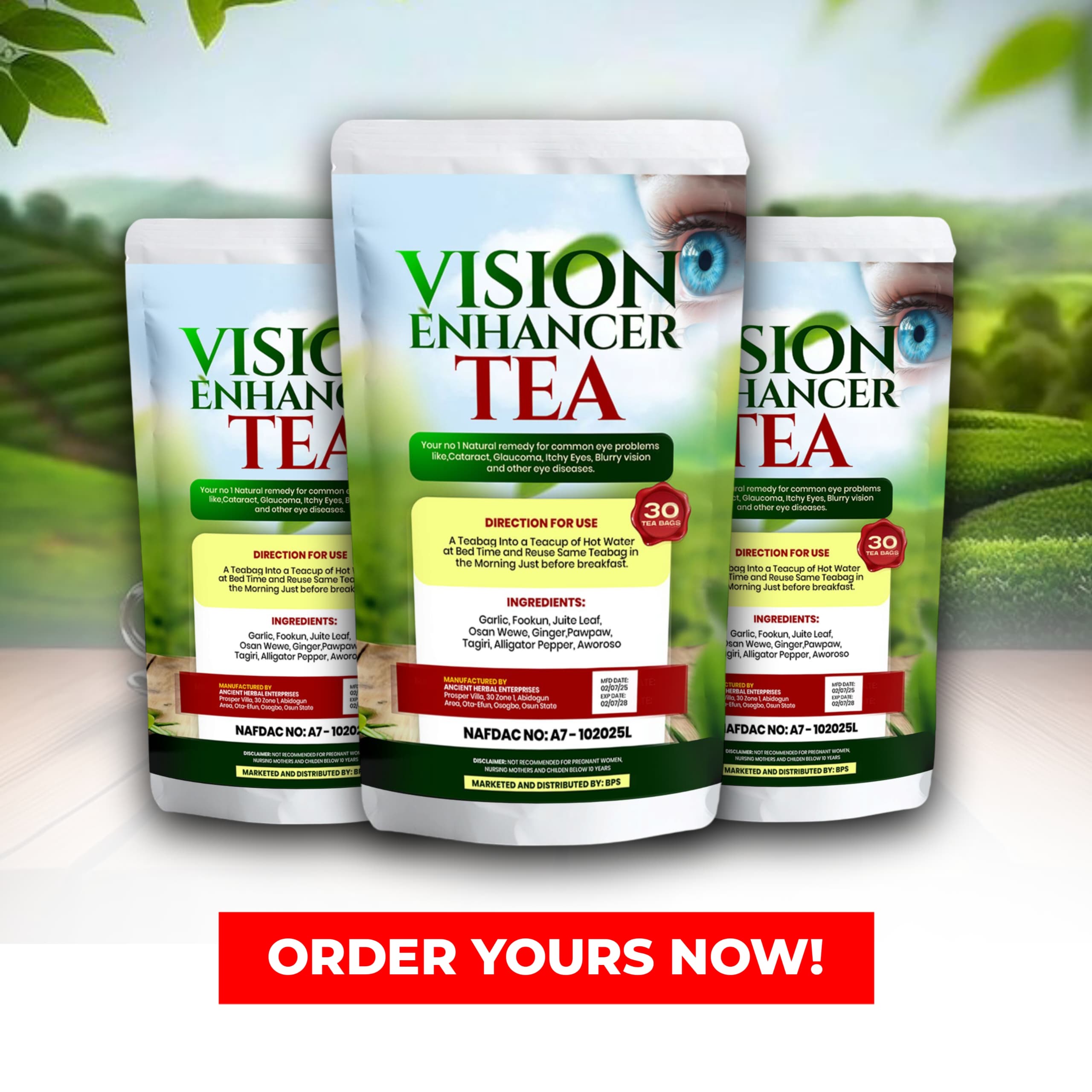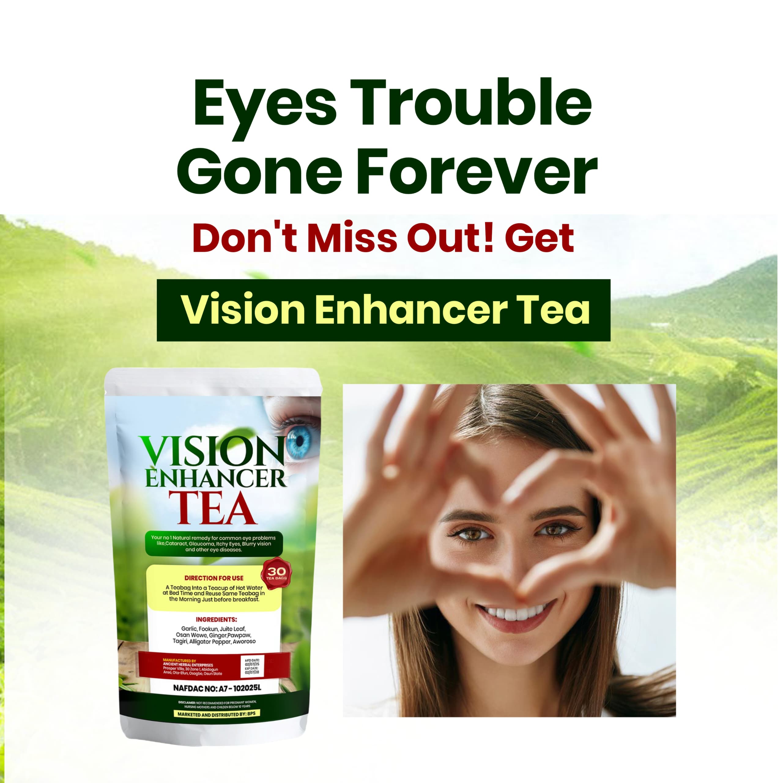 Cataract almost stopped me from my work because I was not seeing clearly, after I bought and drank Vision Enhancer Tea consistently the cataract gradually disappeared.