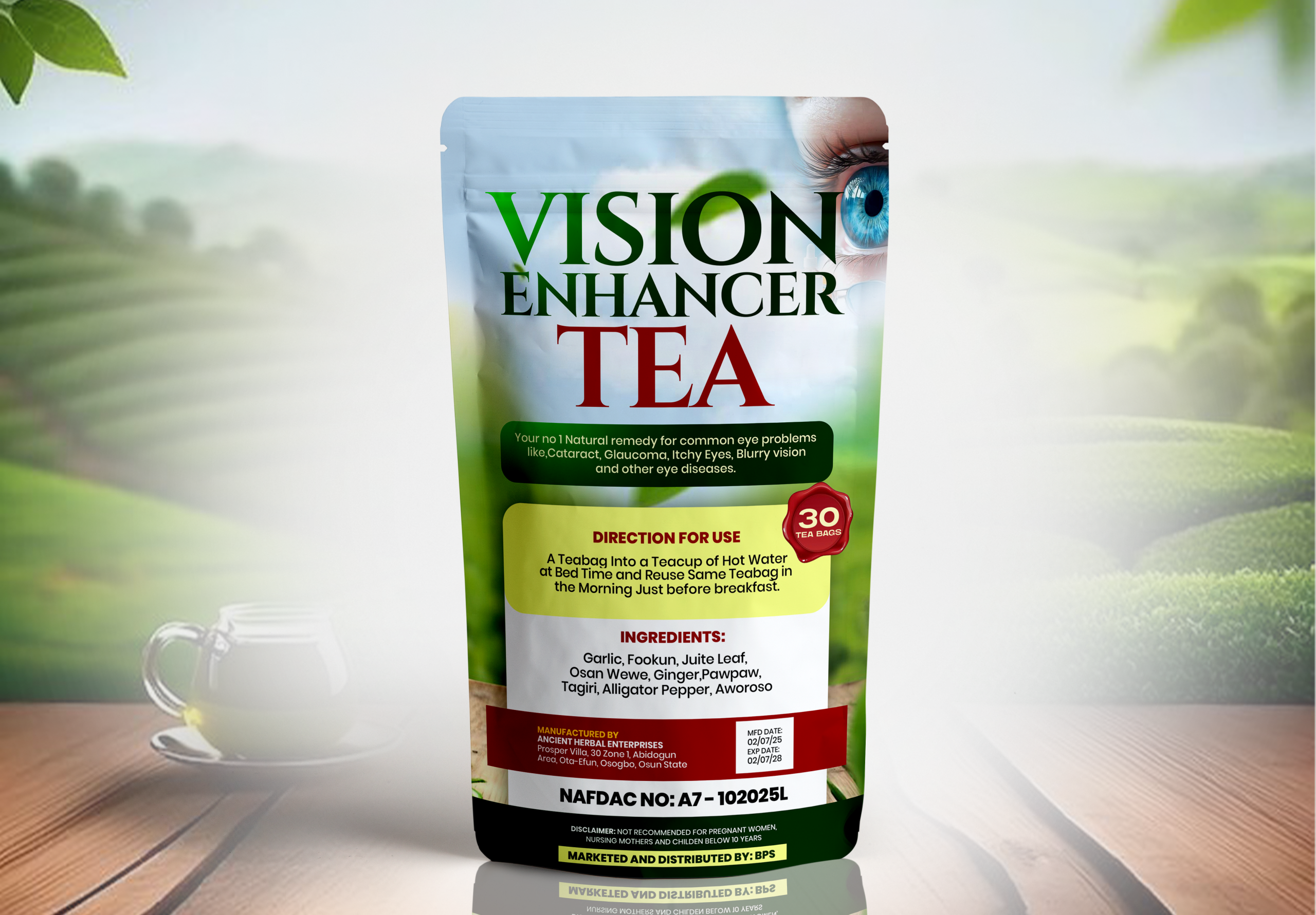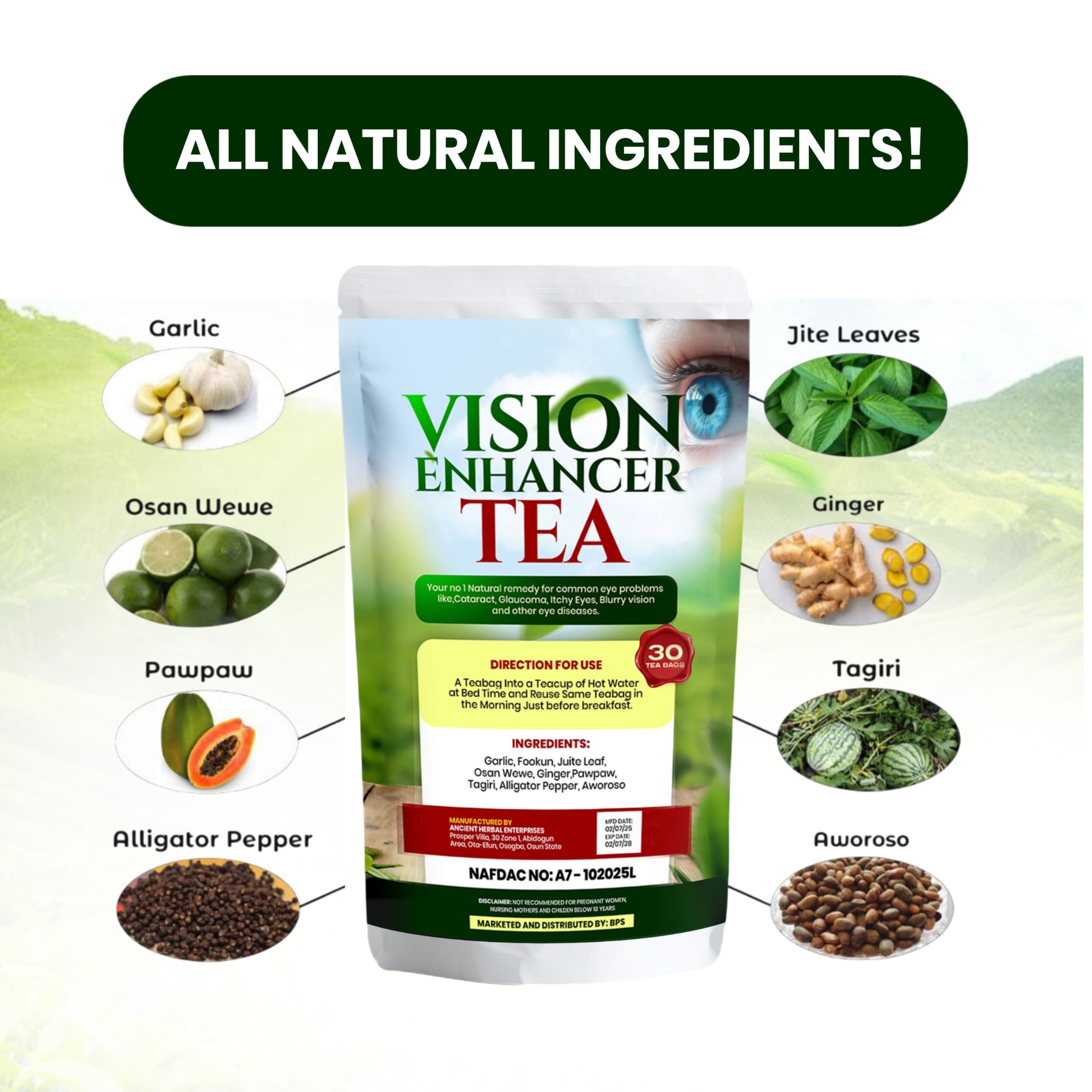 this herbal tea was specially made with blends of natural herbs like garlic, fofokun, juite leaf, osan wewe, ginger, pawpaw, tagiri, alligator pepper and aworoso. each of this herbs were chosen for their individual power eye health Benefits.