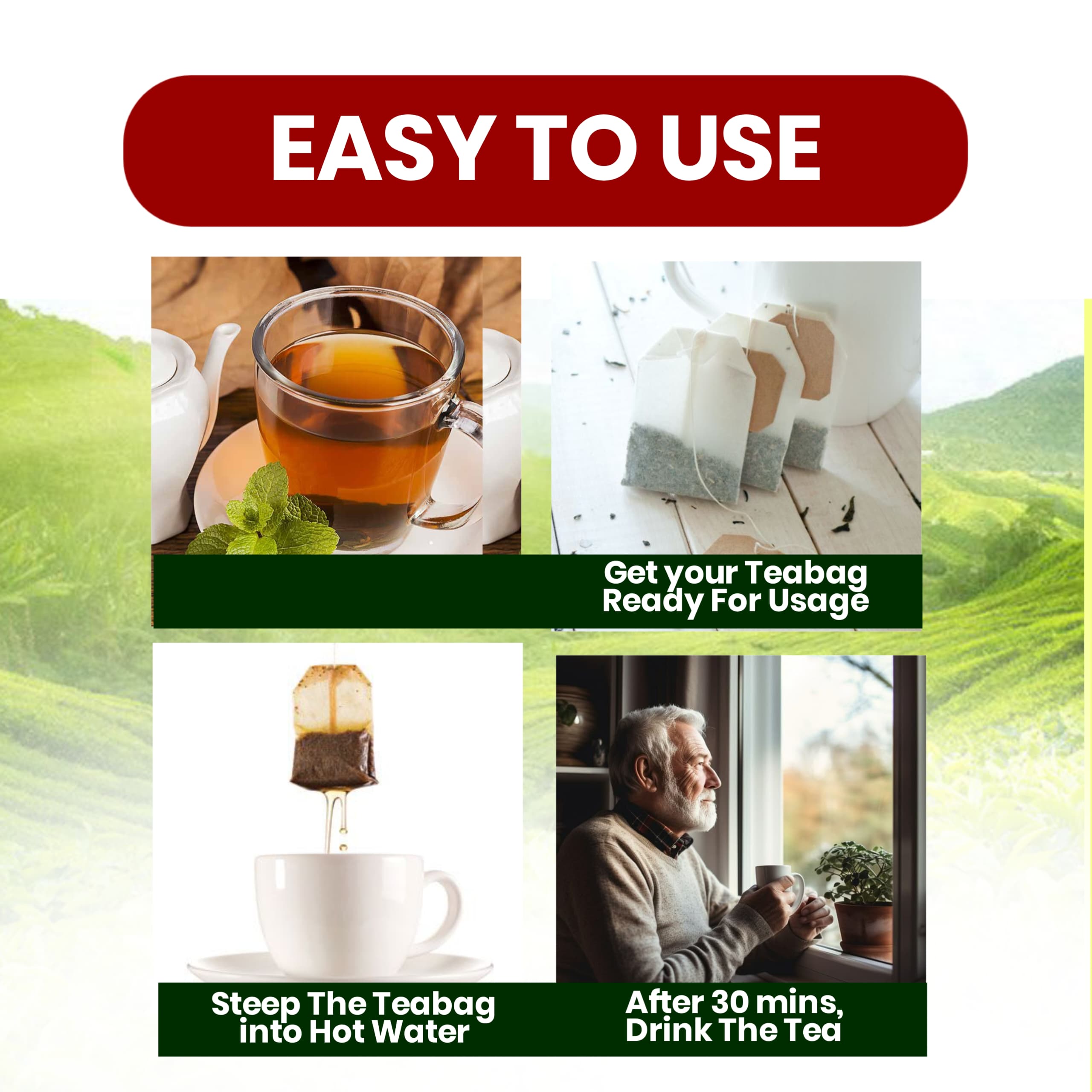 Get your teabag ready for usage, steep the teabag into hot water after 30mins drink the tea in the morning and before bedtime.